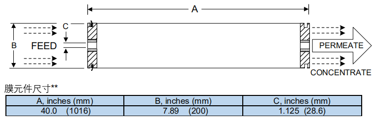 ESPA2 MAX 膜元件膜面積為 440 ft2 (40.9 m2),采用同樣水通量設(shè)計時可節(jié)省約10%膜數(shù)量。ESPA2 MAX一般用于超純水系統(tǒng)或第二級RO系統(tǒng) 。ESPA2 MAX 是8寸膜元件。